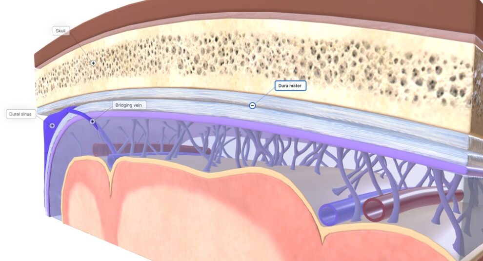 Dann gibt es noch die meningeale Schicht, die näher am Gehirn liegt. Diese bildet eine glatte, ununterbrochene Schicht. Sie setzt dort an, wo die periosteale Schicht aufhört. Meistens sind diese beiden Schichten fest miteinander verbunden, aber an einigen Stellen trennen sie sich und bilden die duralen venösen Sinus. Diese Sinus leiten das Blut aus dem Gehirn ab. Dies ist für die Aufrechterhaltung der Drainagefunktionen von entscheidender Bedeutung.